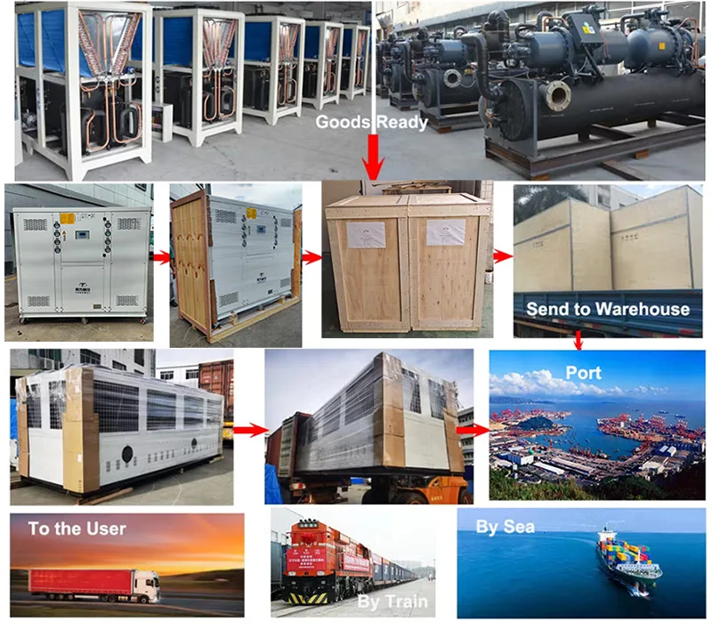 Là nhà cung cấp và xuất khẩu máy làm lạnh nước chuyên nghiệp, chúng tôi có nhà giao nhận vận chuyển riêng để sắp xếp lô hàng. Máy làm lạnh của chúng tôi được đóng gói bằng gỗ dán, giúp ngăn ngừa hư hỏng trong quá trình vận chuyển và đáp ứng các tiêu chuẩn xuất khẩu. Có ba cách để giao thiết bị làm lạnh của bạn: